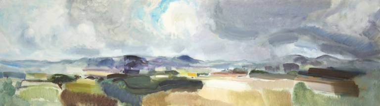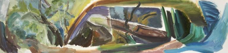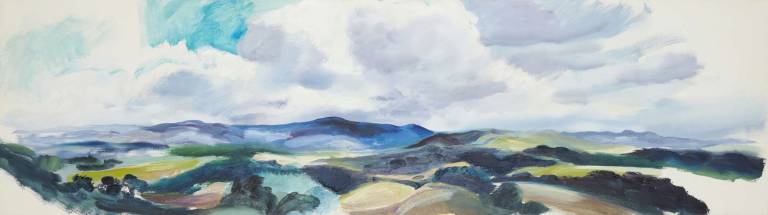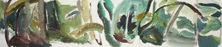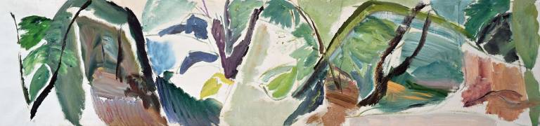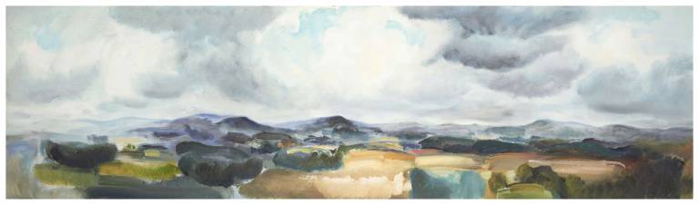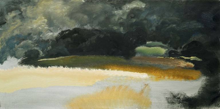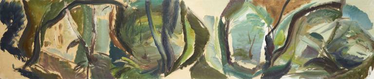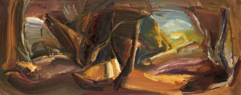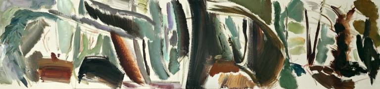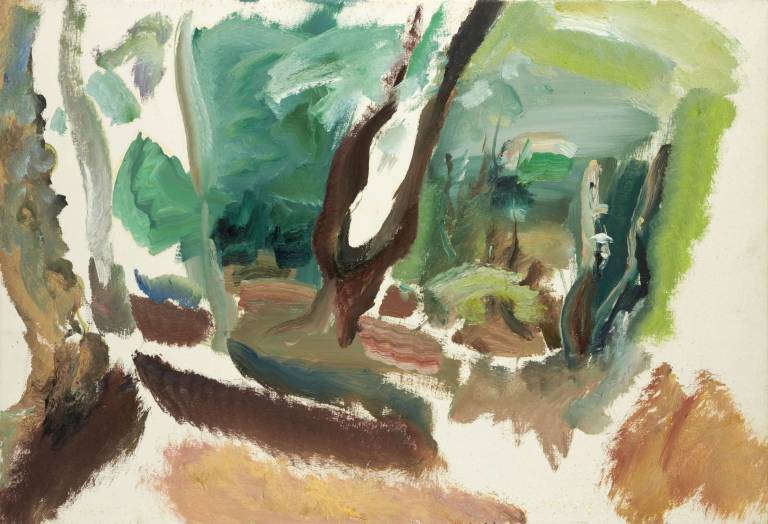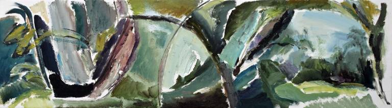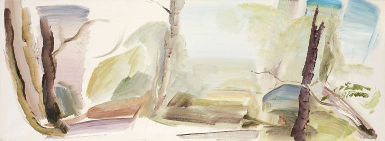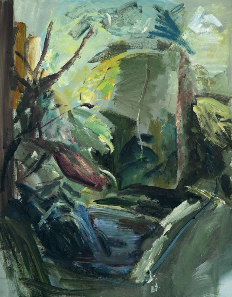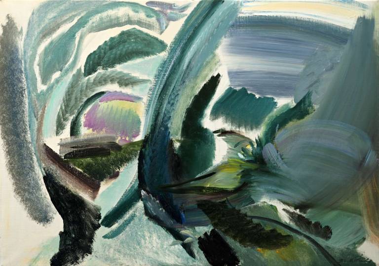 The sky, open space and changing weather fronts become principal motifs for John. After 1975 his work departed from an emphasis on the sky, he gradually realised that the sky, for so long the starting point for the mood of a painting, had in fact become a limitation. He was searching for the compositional freedom to express the formation of the land with a vigorous, gestural means of expression. These paintings saw him flattening the perspective to eliminate the sky and horizon and entering deep into the woodland, analysing the shapes and patterns of trees, clearings, light and shade.